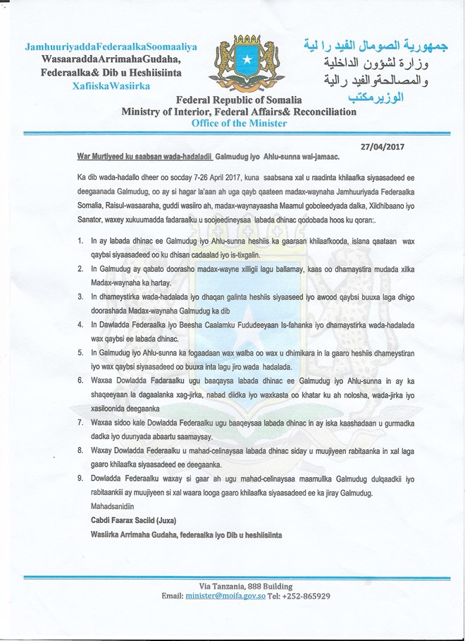 Jimco, April, 28, 2017 (HOL) -Dowladda Federaalka ee Soomaaliya ayaa soo saartay war- murtiyeed ku saabsan wada-hadaladii u-socday maamulladda Galmudug iyo Ahlu-Sunna.
