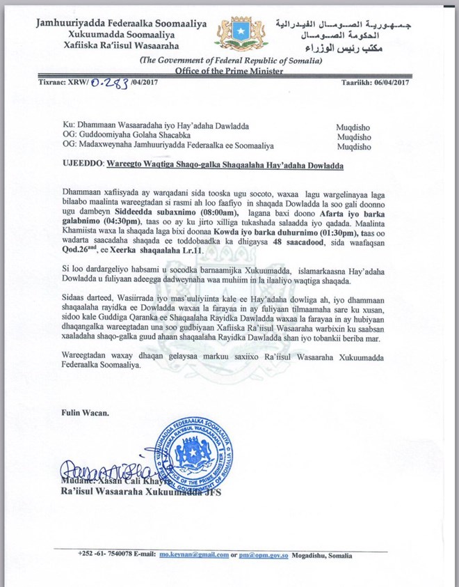 Axad, April, 09, 2017 (HOL) – Ra’iisul wasaaraha Xukuumadda Federaalka ee Soomaaliya Xasan Cali Khayre, ayaa soo saaray wareegto ku saabsan xiliga shaqada shaqaalaha dowladda ay bilaabaneyso iyo xiliga ay dhamaaneeyso.