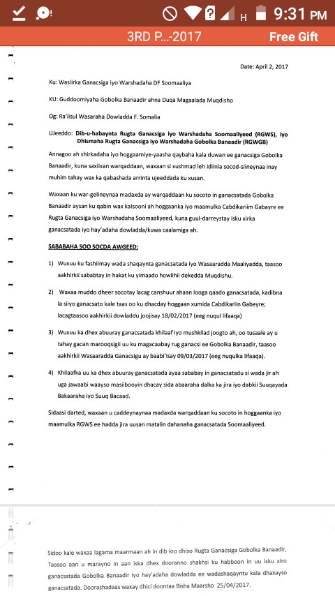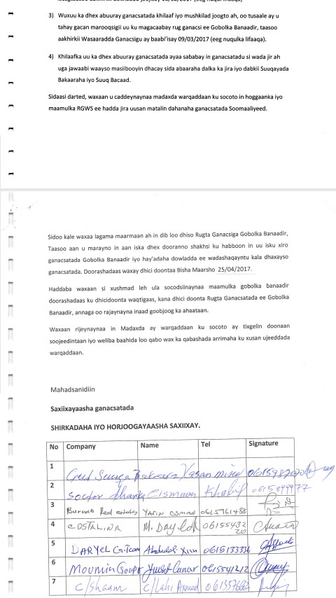 Axad, April, 09, 2017 (HOL) - War qoraal ah oo ay soo saareen gudiga ganacsatada gobolka Banaadir ayaa siweyn looga soo horjeestay guddoonka rugta ganacsiga Soomaaliyeed ee dhawan la doortay, iyaga oo cabasho arintaa ka dhan ah u gudbiyay mas’uuliyiinta dowladda.