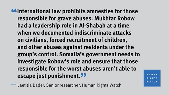 Laetitia Bader oo ah cilmi bare sare oo ka tirsan hay’adda Human Rights Watch oo lagu magacaabo Laetitia Bader ayaa sheegtay in sharciyada caalamiga ay mamnuuc ka tahay in magangelyo la siiyo dadka gala dambiyada waa weyn, iyadoo Mukhtaar Roobow oo ka mid ahaa hoggaamiyeyaasha sare ee Al-shababa, intii uu ka mid ahaa uu galay dambiyo.