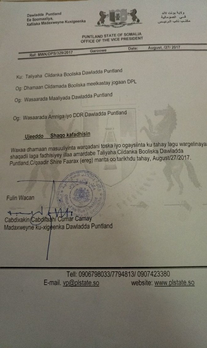 Qoraalka ka soo baxay xafiiska madaxweyne ku-xigeenka Puntland ayaa lagu sheegay in shaqadii laga joojiyay taliyaha ciidamada Booliska Puntland.