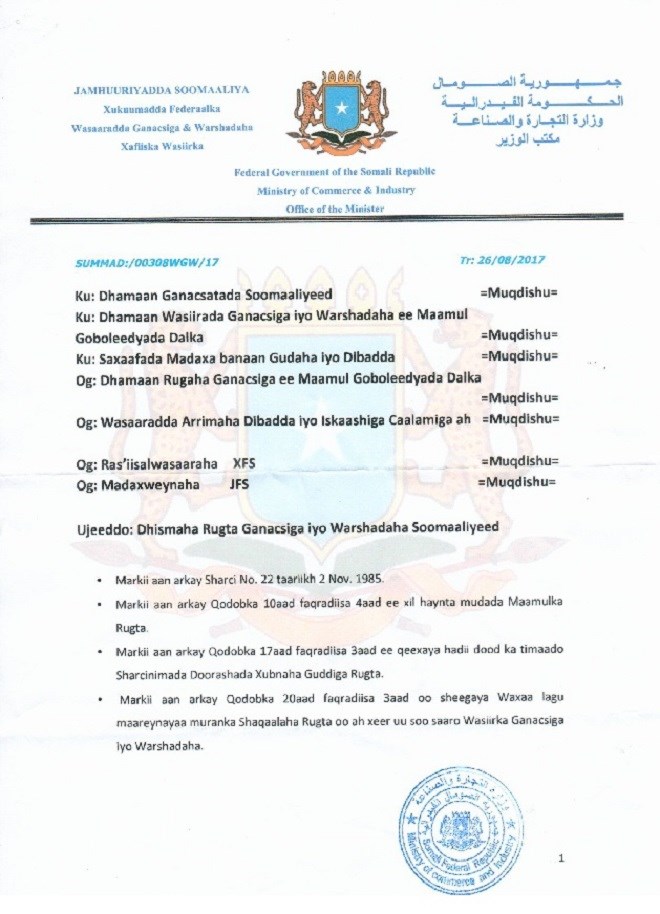 Amarka lagu baabi’iyay rugta ganacsiga ayaa lagu wargaliyay dhamaan madaxda dowladda Soomaaliya, maamul goboleedyada iyo ganacsatada dalka.