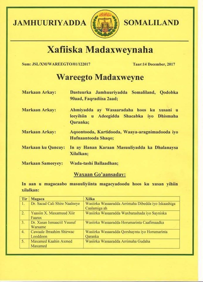 Khamiis, December, 14, 2017 (HOL) – Madaxweynaha cusub ee Somaliland Muuse Biixi Cabdi ayaa ku dhawaaqay xubnihiisa golaha wasiiradda maalin kaddib markii loo dhaariyay xilka madaxweynaha munaasabad shalay ka dhacday xarunta madaxtooyada.