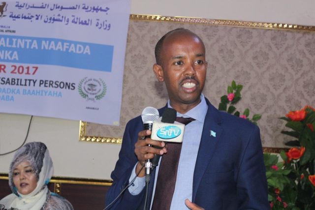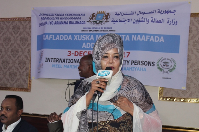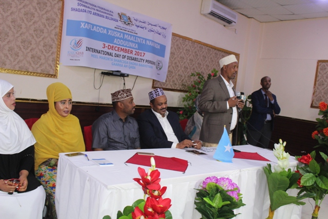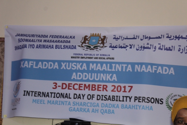 Axad, December, 03, 2017 (HOL) -Munaasabad lagu xusayay Maalinta Caalamiga ee Naafadada Aduunka 03d December ayaa maanta lagu qabtay magaalada Muqdisho iyadoo ay ka soo qeybgaleen Masuuliyiin ka tirsan dowladda Federaalka Soomaaliya oo isugu jira xildhibaanno iyo Wasiiro, Culuma’udiin iyo qaar ka mid ah dadka baahiyaha gaarka ah qaba, .