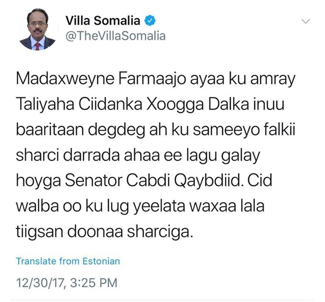 Qoraal kooban oo la soo dhigay Bogga Twitter -ka madaxweynaha ayaa ku amray taliyaha ciidamada xoogga dalka General Cabdiweli Jaamac Gorod in cid walba oo ku lug yeelatana sharciga lala tiigsado.
