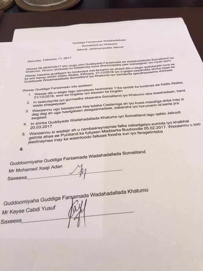 Sabti,Febraayo ,11 , 2017 (HOL) – Wada hadaladdii u socday Somaliland iyo Khaatumo ee ka qabsoomay magaalada Jabuuti ayaa maanta laga soo saaray shan qodob oo la isku afgartay.
