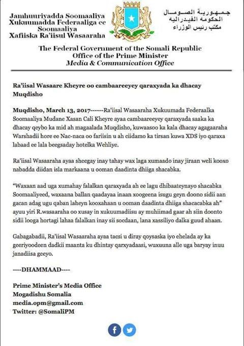 Isniin, Maarso, 13, 2017 (HOL) - Ra’iisal Wasaaraha Xukuumadda Federaalka ee Soomaaliya, Xasan Cali, ayaa cambaareeyay qaraxyadii maanta ka dhacay magaaladda Muqdishu.