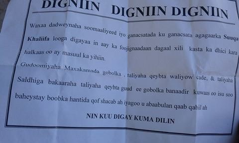 Halkaan ka aqriso mid ka mid ah warqadaha lagu daadiyay Suuqa Bakaaraha.