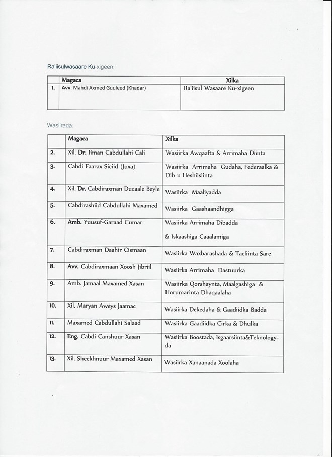 Talaado, Maarso, 21, 2017 (HOL) – Ra’iisal wasaaraha Soomaaliya Xassan Cali Kheyre ayaa goor dhaw oo maanta ah ku dhawaaqay xubnaha gollaha wasiirada xukuumada cusub ee Soomaaliya oo ka kooban 26 wasiir, 26 wasiir ku-xigeen,15 wasiiru-dowle iyo hal ra’iisal wasaare ku-xigeen.