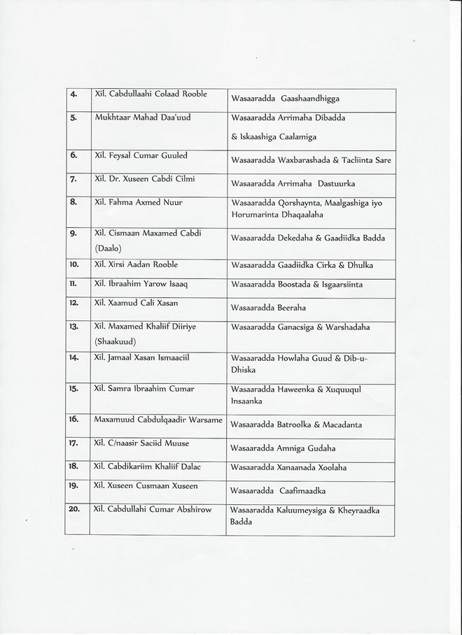 Akhriso liiska xubnaha gollaha wasiirada oo dhameystiran :
