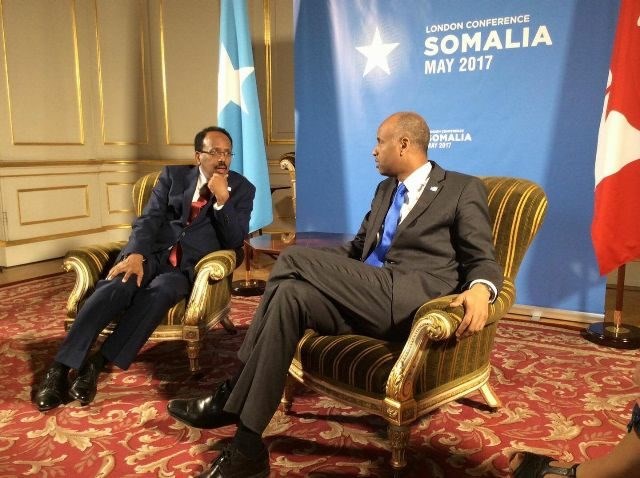 Sabti, May, 13, 2017 (HOL)- Madaxweynaha Jamhuuriyadda Federaalka ee Soomaaliya Mudane Maxamed Abdullahi “Farmajo” ayaa intii uu joogay magaalladda London la kulmay Wasiirka Socdaalka, Qaxootiga iyo jinsiyadaha dalka Canada Ahmed Hussein, oo dhinaca kalana ah muwaadin ka soo jeeda Soomaaliyeed.