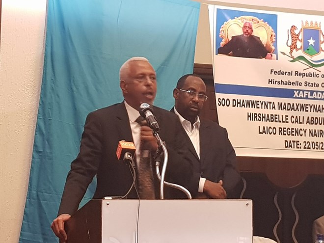 Talaado, May, 23, 2017 (HOL) - Madaxweynaha maamul gobolleedka Hirshabeelle Cali C/llaahi Cosoble ayaa oo ka qeybgallayay munaasabad soo dhaweyn ah oo loogu sameeyay magaalada Nairobi ayaa halkaa uga dhawaaqay gogol lagu dhisayo sida uu hadalka u dhigay maamul uu yeesho gobolka Banaadir.