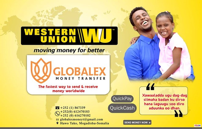 Talaado, October, 17, 2017 (HOL) – Waa talaabo dhinaca Xawillaada iyo isku gudbinta lacagaha oo horay loo qaaday iyadoo Bankigan Western Union uu noqonayo Bankigii ugu horeeyay ee noociisa oo laga hergaliyo dalka Soomaaliya marka laga soo tago shirkadaha kale ee Xawaaladaha ka shaqeeya.