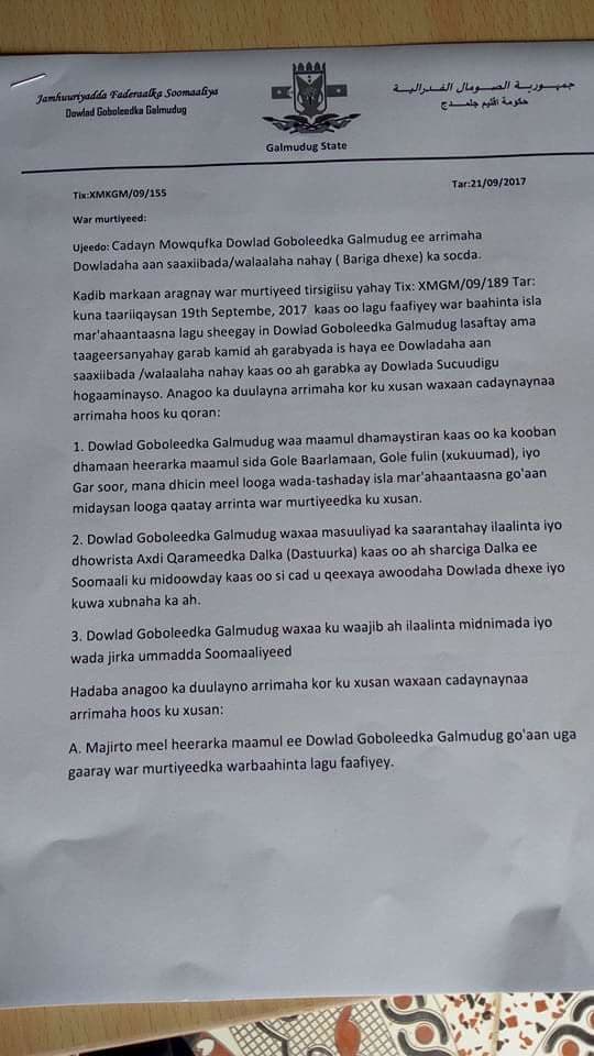 Hadaba Hoos ka Akhriso qoraaalka danbe ee ka soo baxay Galmudug :