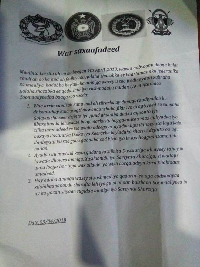 Arbaco, April, 04, 2018 (HOL)- Hay’addaha Nabad-galyada dowladda federaalka ayaa war Qoraal ah oo ka soo baxay ugu baaqay xildhibaannada Golaha Shacabka in ay ciidamada kala shaqeeyaan sugida Amniga.