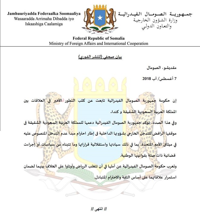 Qoraal Afka Carabiga lagu daabacay oo ka soo baxay wasaaradda arrimaha dibedda ayaa lagu sheegay in dowladda Soomaaliya Soomaaliya si dhaw ula socto xaaladihii ugu danbeeyay ee ka soo kordhay xiriirka dowladdaha Sacuudiga iyo Canada.