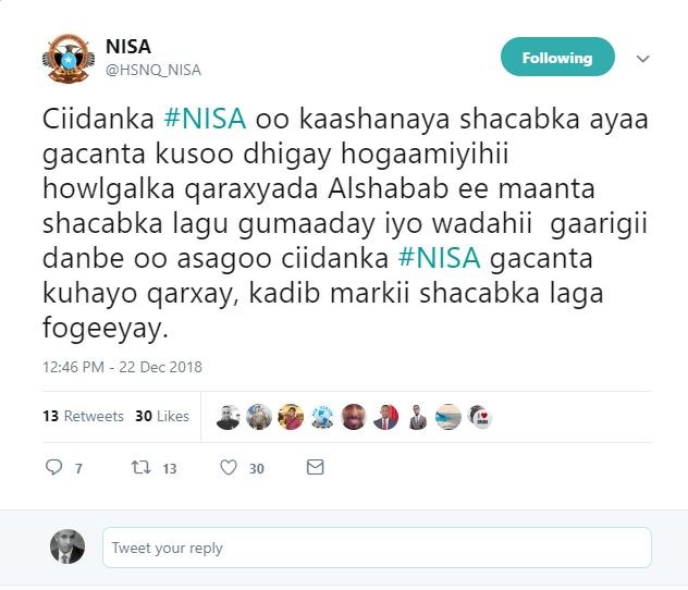 Sabti, December, 22, 2018 (HOL)-Hay'adda Nabad Sugidda iyo Sirdoonka Soomaaliya ee NISA ayaa sheegtay in ay gacanta ku soo dhigeen qofkii haggaha ka ahaaweeraradii qaraxyada ahaa ee Muqdisho ka dhacay maanta.