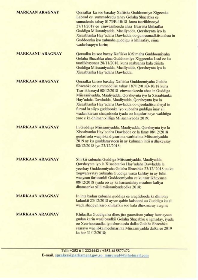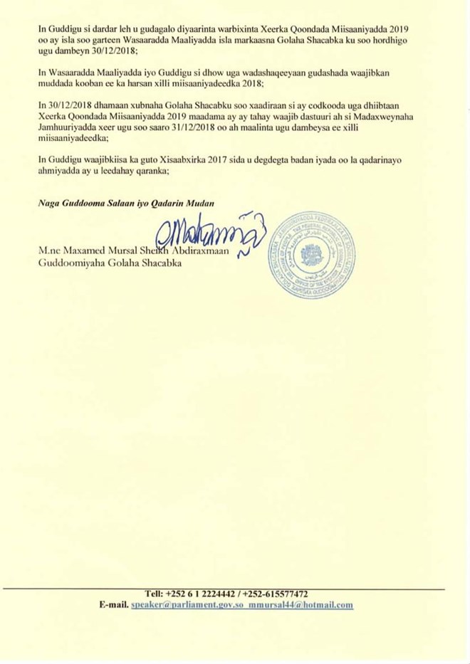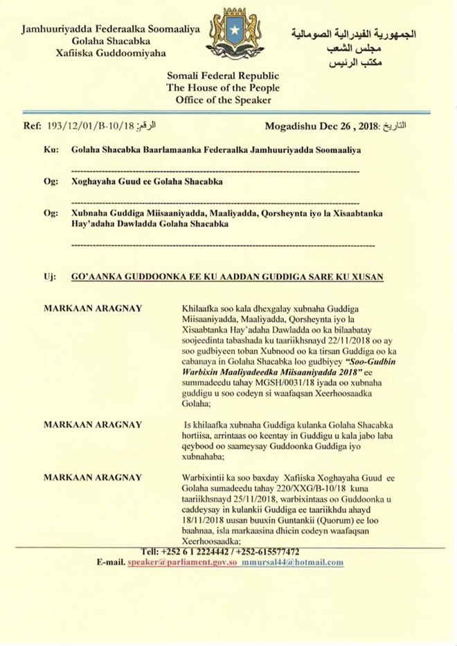 Arbaco, December, 26, 2018 (HOL)- Wareegto ka soo baxday xafiiska Guddoomiyaha Golaha Shacabka Maxamed Mursal Sheekh Cabdiraxmaan oo Nuqul kamid ah soo gaaray Hiiraan Online ayeey Guddoonka Goluhu ku go’aamiyeen in dib-u-habeyn lagu sameeyo Guddiga Maaliyadda, iyada oo Guddiga la faray in Miisaaniyadda 2019 la horkeeno Golaha 30/12/2018 si loogu codeeyo.