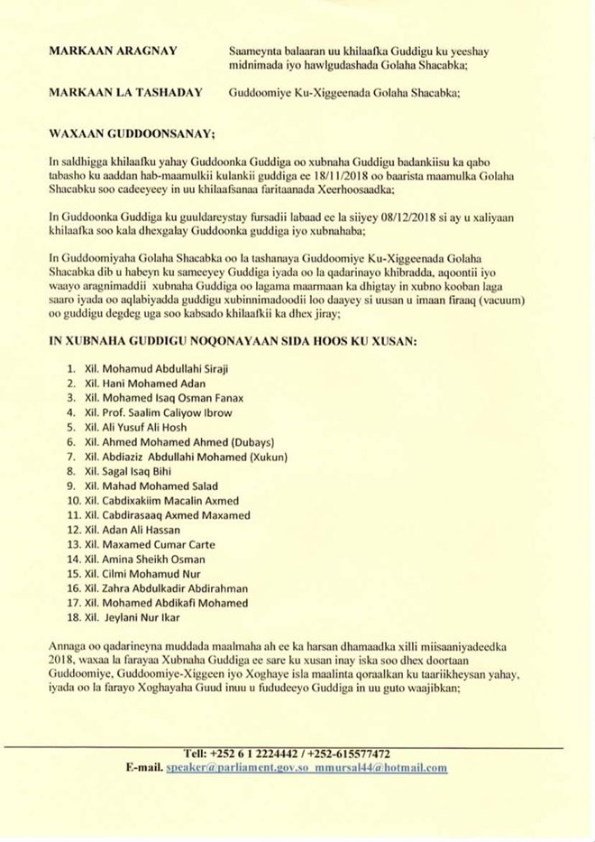 Hoose ka Akhriso Qoraalka ka soo baxay guddoonka Golaha Shacabka :