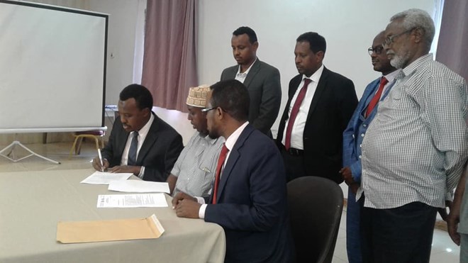 Gudoomiyaha Naadiga Madbacada Cumar Mugaabe Agaasimaha guud ee Wasaarada Warfaafinta C/raxmaan Alcadaala Iyo Gudoomiyaha xiriirka Kubadda Cagta C/Qani Saciid Carab ayaa kala saxiixday qorshaha cusub ee dib loogu howlgalinayo Naadigaasi.