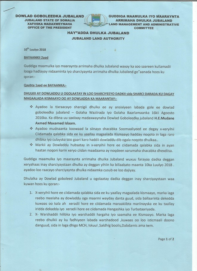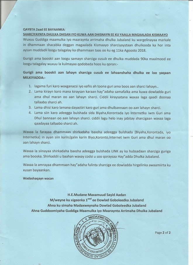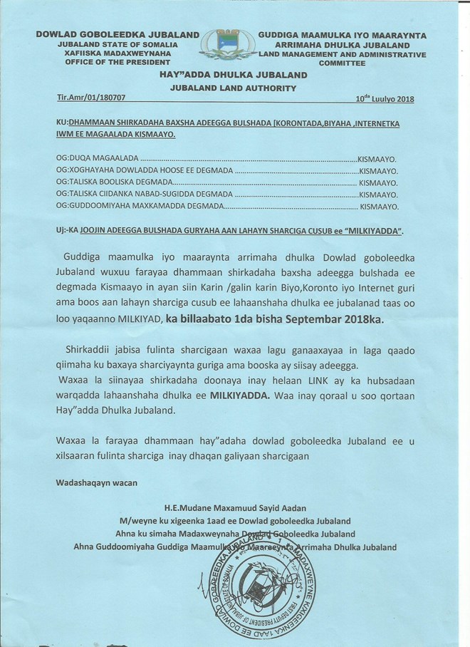 Arbaco, July, 11. 2018 (HOL)–Wareegto kasoo baxday gudiga dhulka Jubbaland ayaa guud ahaan guryaha aan sharciyeysnayn ee magaalada Kismaayo looga mamnuucay helitaanka adeegyada ay kamidka yihiin korontada, biyaha iyo Internetka.