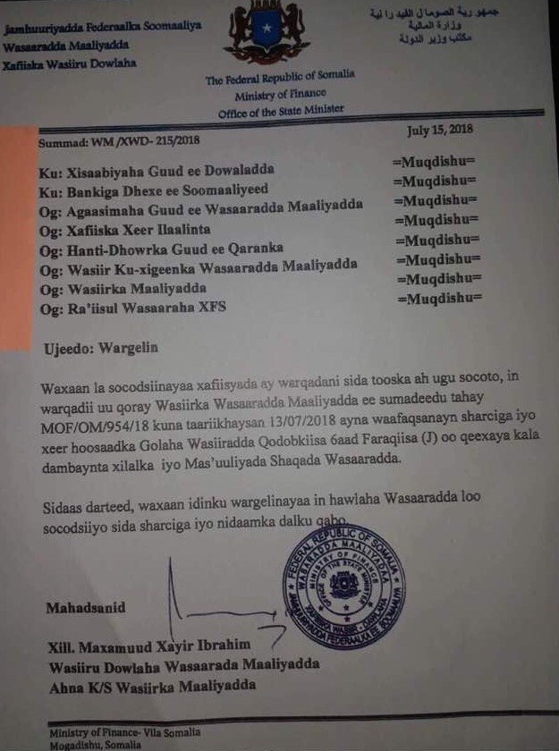 Qoraalka Wasiiru-dowlaha ayaa sidoo kale la gaaarsiiyay Xisaabiyaha Guud, Bankiga Dhexe, Agaasimaha Guud ee Wasaaradda iyo Hanti dhowrka Guud, kuna ogeysiiyay Ra’iisul Wasaaraha intaba.