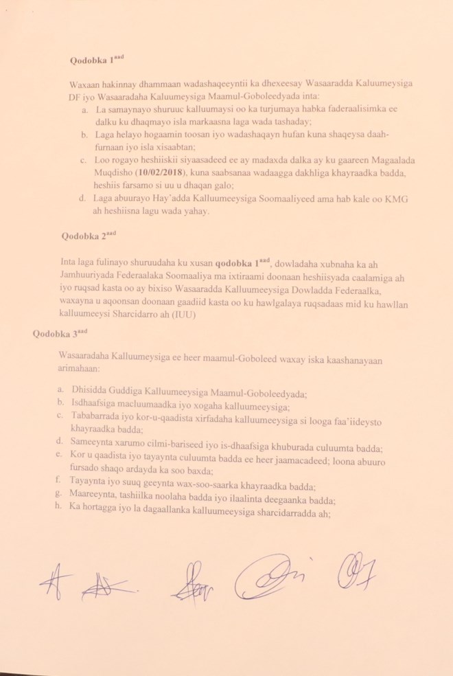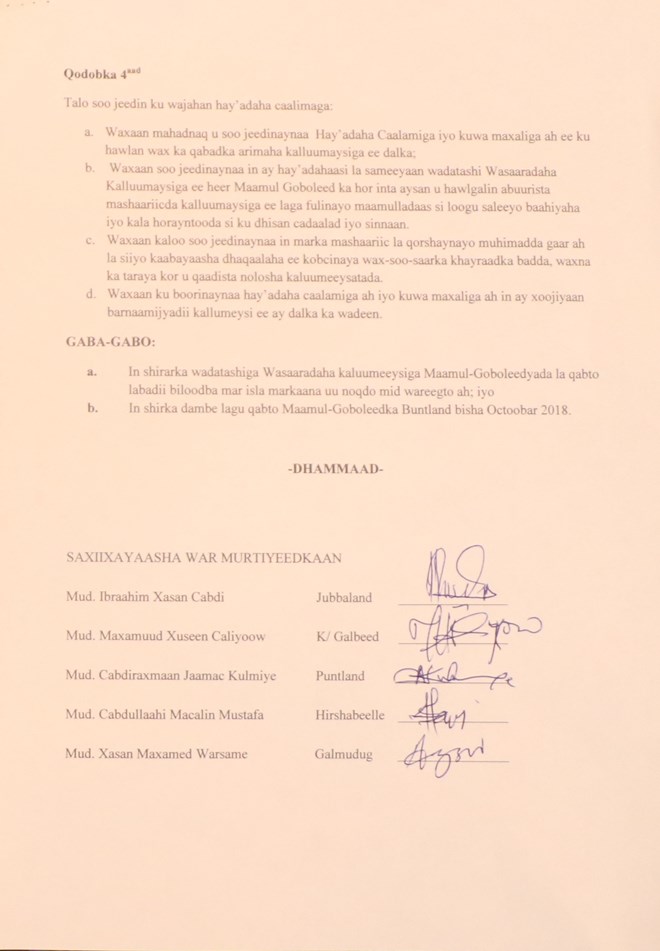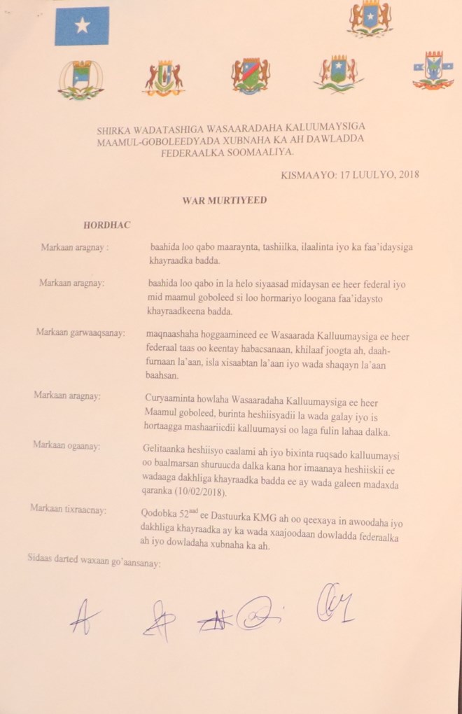 Talaado, July, 17, 2018 (HOL)-Kadib kulan qaatay sedex maalmood oo ay magaalada Kismaayo ku yeesheen wasiirro iyo wasiir kuxigeenno ka socday wasaaradaha kalluumeysiga iyo khayraadka badda dowlad goboleedyada ayaa waxaa ay maanta shirkooda kasoo saareen war murtiyeed.
