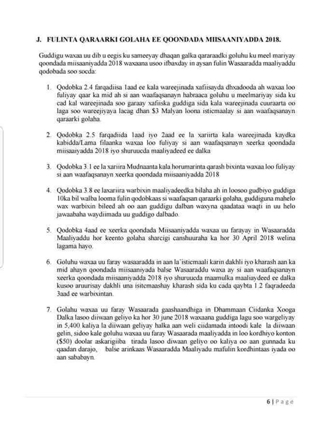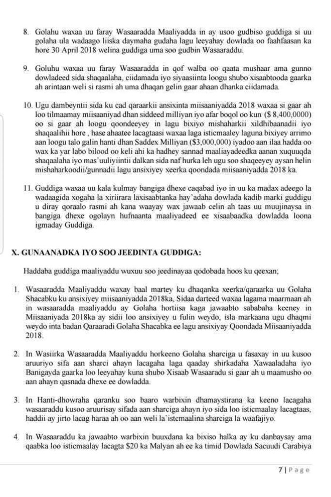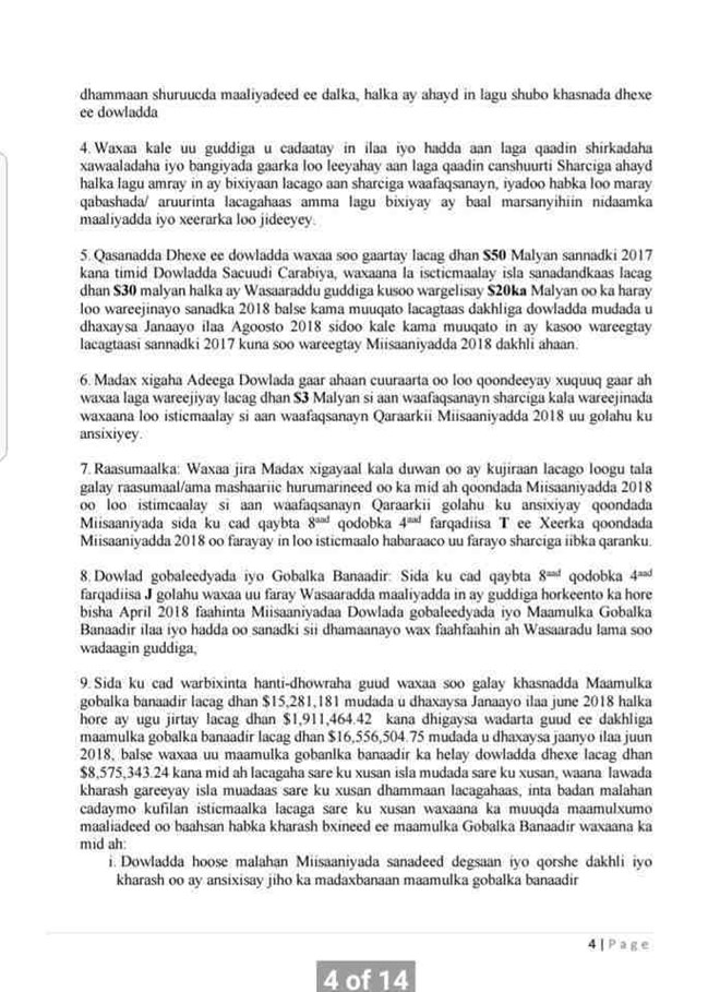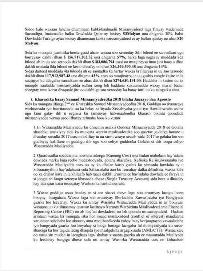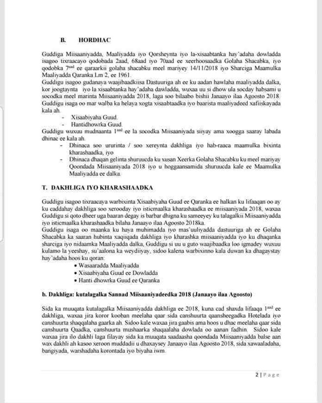 newsinside Warbixin dheer oo uu guddigu soo saaray ayaa looga hadlay wax is daba marin iyo in si qaldan loo maamulay miisaaniyadda dalka laga soo bilaabo Janaayo illaa Agosto.