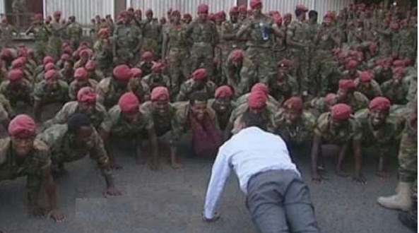 newsinsideBalse markii uu Ra'iisul wasaaruhu uu soo baxay si uu ula kulmo boqollaal kamid ah ciidamadda dalkaas oo ku labbisan dareeska kuma aanu farxin in qaarkood ay dareen dhaliyeen hubkii ay siteen,sidaas darteed wuxuu faray in ay kac fadhiistaan oo ay jimicsi sameeyaan, taas oo ciqaab ku ahayd ciidamaddii hubaysnaa.