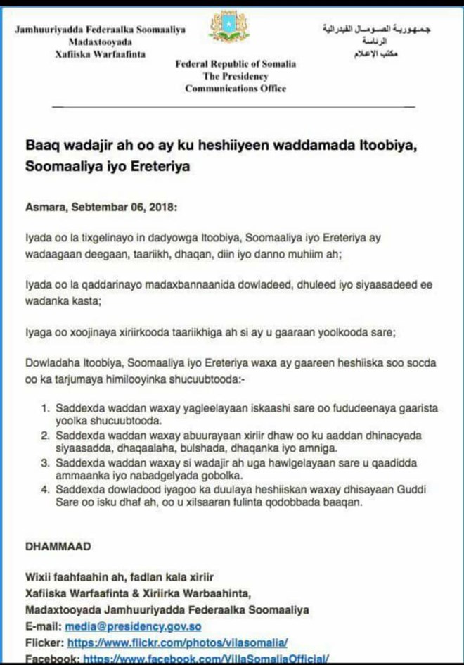 Waxayn ku heshiiyeen "in la billaabo wada xaajoodyo lagu dhammeynayo arrimahaas si loo xaqiijinayo danaha isku tolan ee dalalka Geeska Afrika kuwaas oo horseedaya nabadda iyo horumarka gobolka," ayuu yiri agaasimaha warfaafinta ee madaxtooyada Soomaaliya Cabdinuur Maxamed Axmed.
