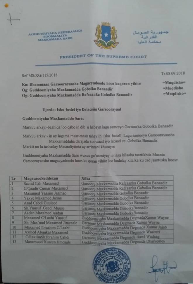 Sabti, September, 08, 2018 (HOL)- Guddoomiyaha Maxkamadda Sare ee dalka Baashe Yuusuf Axmed ayaa dib u habeyn ku sameeyey Garsoorayaasha Maxkamadaha Darajada 1-aad iyo 2-aad ee gobolka Baanaadir, isagoo dala-csiin iyo isku bedel ku sameeyey qaar kamid ah Garsoorayaasha.