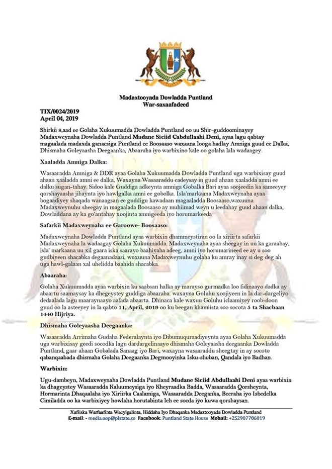 Khamiis, April, 04, 2019 (HOL)– Shirkii 8aad ee Golaha Xukuumadda Puntland oo uu Shir-guddoominayey Madaxweynaha Puntland,Siciid Cabdullaahi Deni ayaa lagu qabtay magaalada Boosaaso waxaana looga hadlay Amniga guud, Dhismaha Goleyaasha Deegaanka, Abaaraha iyo warbixino kale oo golaha lala wadaagey.
