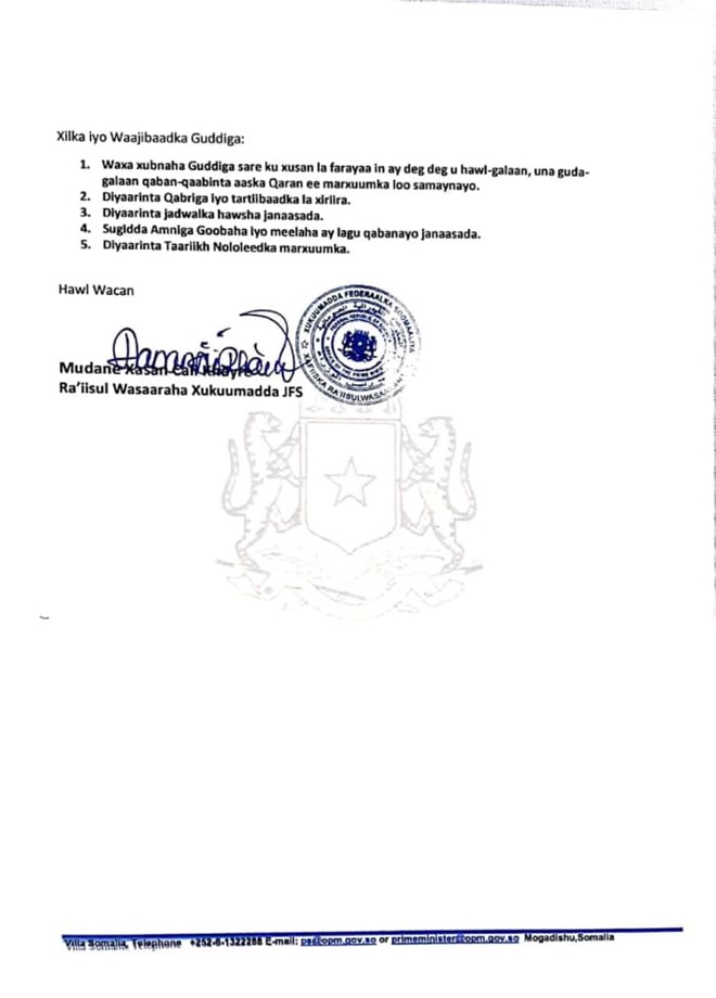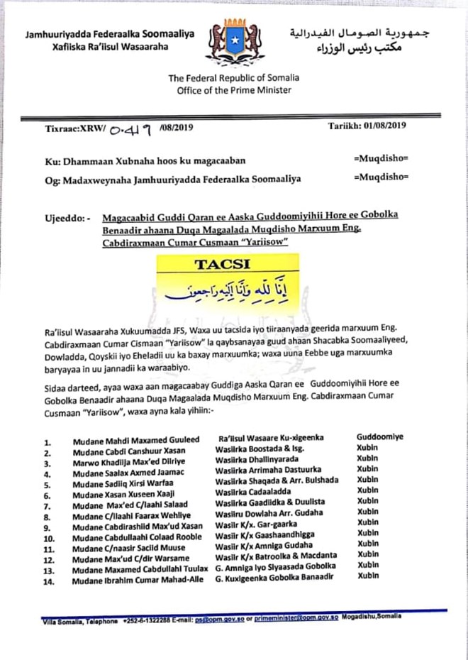 Khamiis, Augusto, 01 2019 (HOL)- Ra’iisul Wasaaraha Xukuumadda Federaalka Soomaaliya Xasan Cali Kheyre ayaa Guddi ka kooban Afar iyo Toban Xubnood u magacaabay Aaska Qaranka ee loo sameynayo Guddoomiyahii gobolka Banaadir ahna Duqii Muqdisho Marxuum Cabdiraxmaan Cumar Cismaan Yariisoow oo maanta ku geeriyooday dalka Qatar, Waxaana guddigaan guddoomiye u ah Ra’iisul wasaare ku-xiggeenka XFS.