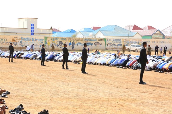 newsinsideMadaxweyne Ku-xigeenka Puntland ,Axmed Cilmi Cismaan Karaash ayaa sidoo kale la oogey salaadda ciidda shacabka, masuuliyiin ka tirsan Goleyaasha maamulka , isimmo, nabadoonno, waxgarad, siyaasiyiin iyo masuuliyiin kale ayaa qayb ka ahaa munaasabadda.
