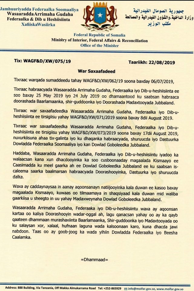 Khamiis, Augusto, 22, 2019 (HOL)-Wasaaradda arrimaha gudaha Xukuumadda Soomaaliya ayaa sheegtay in aysan aqoonsaneyn doorashadii Kismaayo, isla markaana la walaacsan tahay shaqsiyaadka kala duwa ee mid walba gaarkiis u sheegto inuu yahay Madaxweynaha Jubbaland.