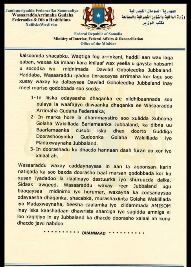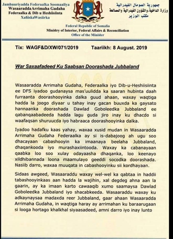 Jimco, Augusto, 09, 2019 (HOL)- War qoraal ah oo ka soo baxay Wasaaradda Arrimaha Gudaha Dowladda Soomaaliya ayaa lagu sheegay in Wasaarraddu marnaba aqoonsan doonin natiijo kasta oo ka soo baxda doorashada Jubbaland, haddii aan la raacin qoddobo ay Wasaarraddu ka dalbatay maamulka Jubbaland in lagu saleeyo doorashada.