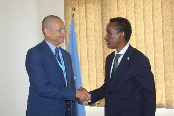 Axad, July, 28, 2019 (HOL)-Wasiirka Arrimaha Dibadda iyo Iskaashiga Caalamiga, Mudane Danjire Axmed Ciise Cawad, ayaa maanta xafiiskiisa Wasaaradda kaga guddoomay warqadaha aqoonsiga Wakiilka cusub ee Barnaamijka Cunnada Adduunka ee Qaramada Midoobey ee marka magaciisa la soo gaabiyo loo yaqaan (WFP) u qaabilsan Soomaaliya Cesar Arroyo.