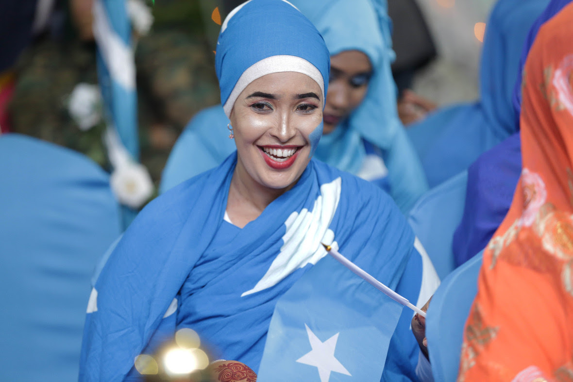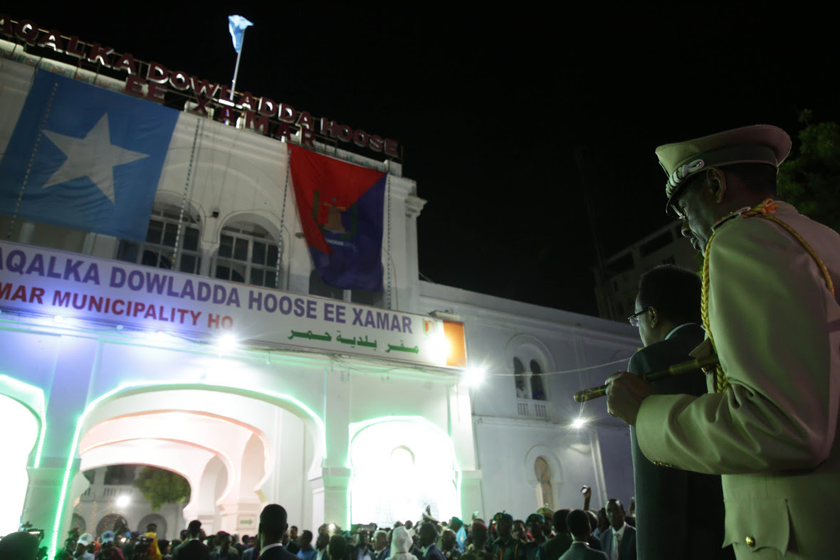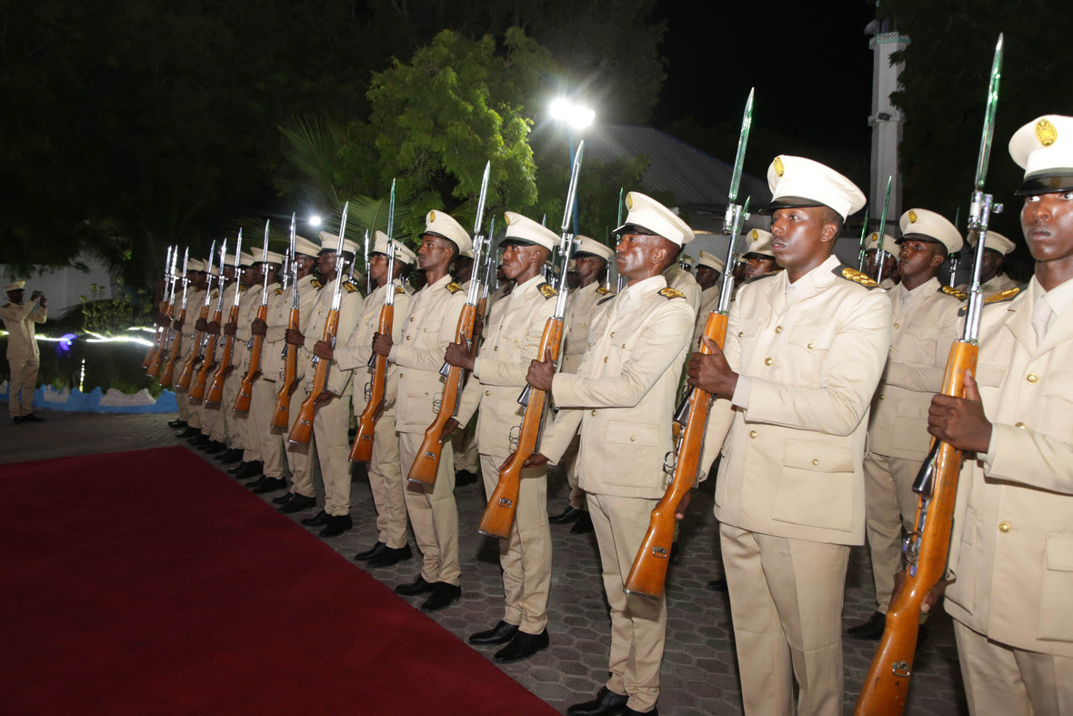 Dhanka kale, Madaxweyne Maxamed Cabdullaahi Farmaajo oo salaan sharaf ay siinayaan cutubyo ka tirsan Ciidanka Xoogga Dalka, baambaydunu ay ku maamuusayso heesta Calanka ayaa calan-saaray Aqalka Dowladda Hoose ee Xamar, halkaas oo ay munaasabaddu ku qabsoontay.]