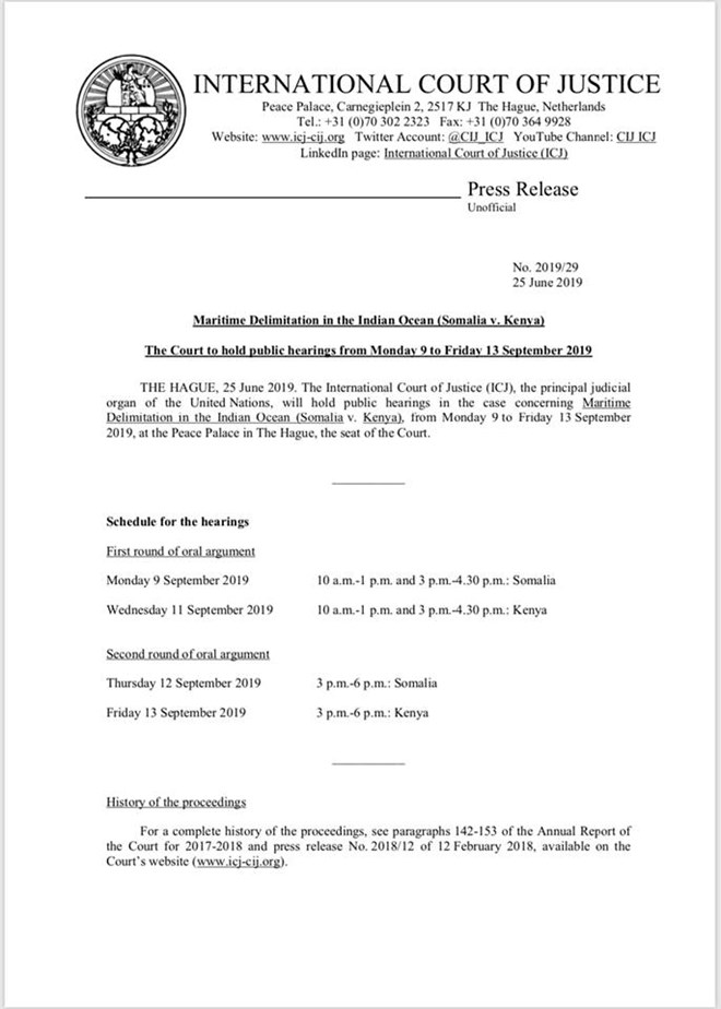 Arbaco, June, 26, 2019 (HOL) -Maxkamadda caalamiga ah ee cadaaladda (ICJ) ayaa ku dhawaaqday xilliga ay dib u billaabeyso dhageysiga kiiska Soomaaliya ay u gudbisay ee ka dhanka ah Kenya.