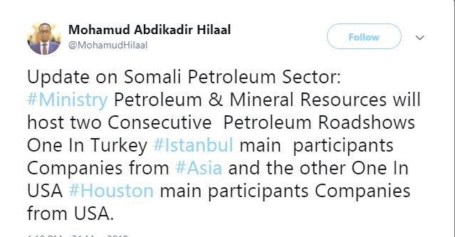 Isniin, June, 03, 2019 (HOL) - Qoraal uu soo dhiggay bartiisa Twitter-ka Wasiir kuxigeenka Wasaaradda Batroolka Soomaaliya Maxamuud Cabduqaadir Hilaal ayuu ku sheegay in Shirka koowad lagu qabanayo Turkiga,isla markaana ay ka qeyb geli doonaan Shirkado laga leeyahay dalkaas, kuwaas oo daneynaya Shidaalka Soomaaliya.