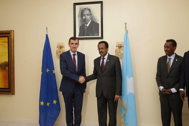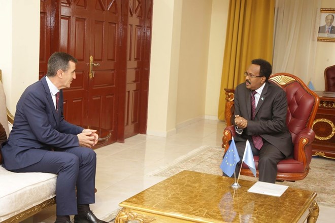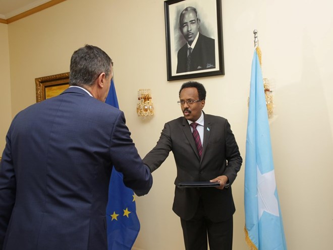 Madaxweynaha ayaa danjiraha cusub ee Midowga Yurub uga mahadceliyey taageerada joogtada ah ee ay la garab taaganyihiin Soomaaliya iyo kaalinta muuqata ee ay ku leeyihiin dib u dhiska Iyo nabadeynta dalka.