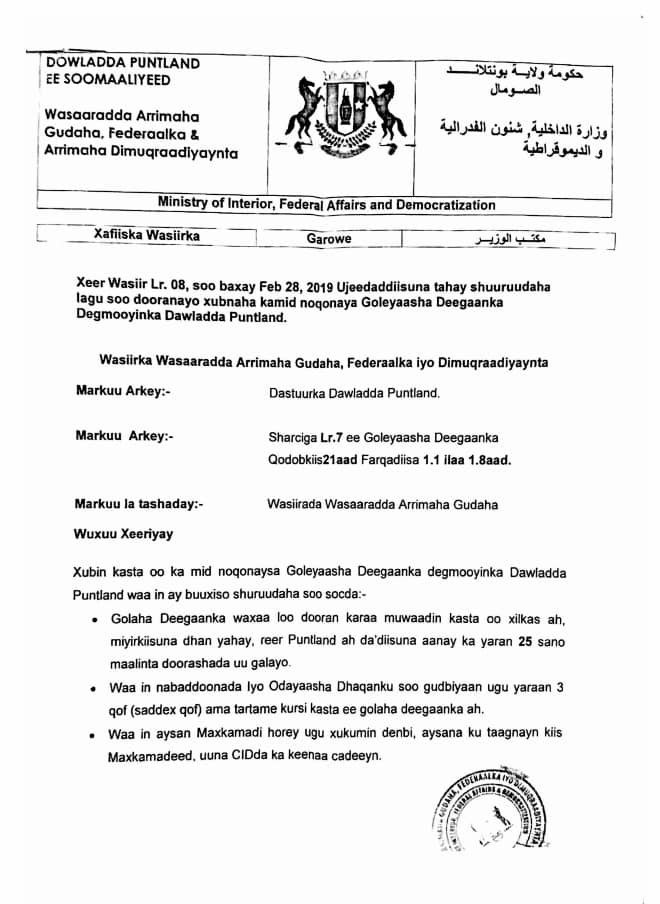 newsinsideWarqad uu ku saxiixnaa wasiirka arrimaha gudaha oo lagu soo bandhigay shuruudaha ayaa ku soo aadday xilli ay Puntland ka socoto dhismaha golayaasha deegaanka ee degmooyinka.