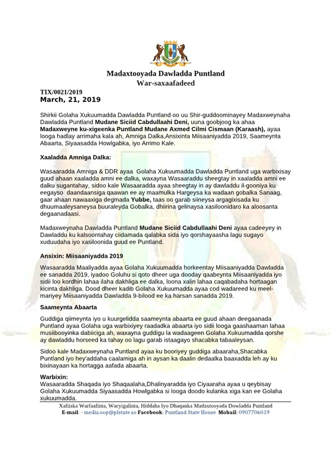 newsinsideShirka golaha wasiirrada Puntland oo uu guddoomiyay madaxweynaha Puntland, Siciid Cabdullaahi Deni ayaa sidoo kale looga hadlay arrimaha amniga,iyadoo wasiirrada ay sheegeen in si dhow ay ula socoto Puntland dhaqdhaqaaqyada ciidanka Soomaaliland ee gobolka Sanaag.