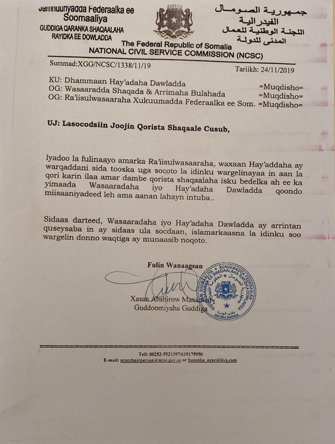 Khamiis, November, 28, 2019 (HOL)-Qoraalka ka soo baxay Guddiga Shaqaalaha Rayidka Dowladda Soomaaliya ayaa waxaa lagu wargeliyey Hay’adaha kala duwan ee Dowladda in aysan qori karin Shaqaalaha ka yimaada wasaaradaha ee leh qoondo miisaaniyadeed iyo kuwo aanan laheyn intaba.