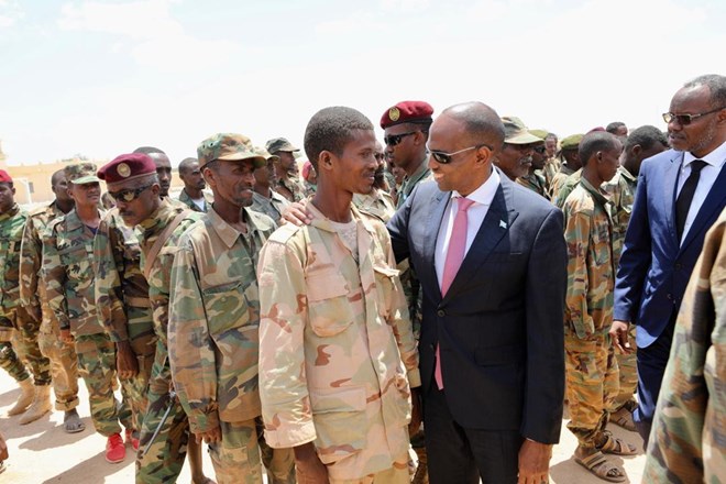 Arbaco, September, 11, 2019 (HOL)- Ra’iisul Wasaaraha xukuumadda federaalka Soomaaliya, Xasan Cali Khayre ayaa maanta booqasho ugu tegay ciidamada xoogga dalka ee qeybta ka qaatay xoreynta Xudur, Ciidamo ka tirsan Koonfur Galbeed iyo ciidamo tababar kasoo baxay, oo la qarameynayo si ay qayb uga noqdaan ciidanka xoogga dalka ee loo qorsheynayo xoreynta deegaannada argagaxisadu uga sugantahay gobalka Bakool.
