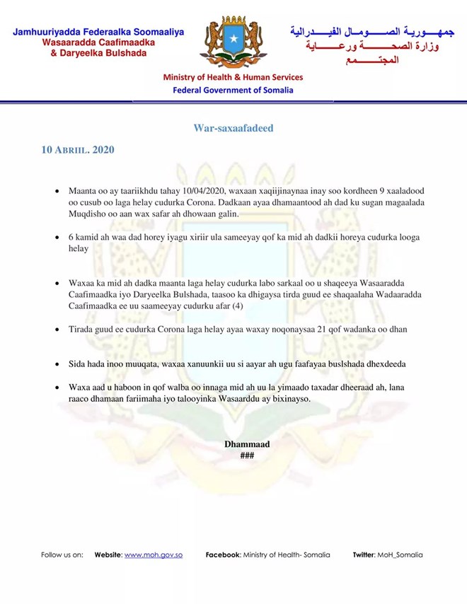 Jimco, Abril, 10, 2020 (HOL)- Wasaaradda caafimaadka ee Jamhuuriyadda Soomaaliya ayaa waxey shaaca ka qaadday in maanta oo keliya waddanka laga helay 9 kiis oo cusub oo ah xanuunka COVID-19, taas oo muujineysa in bukaannada cudurka uu soo ridanayo ay kor usii kacayaan .