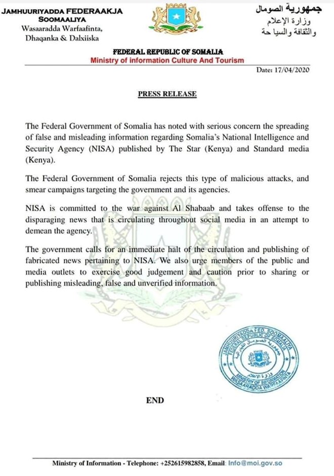 Sabti, Abril 18, 2020 (HOL) - Qoraal kasoo baxay wasaarada warfaafinta Soomaaliya ayaa looga hadlay wararka aay tabisay warbaahinta Kenya islamarkaana aay soo xigteen warbaahinta Soomaalida oo ku aadanaa xariir dhexmaray hay’ada nabadsugida Soomaaliya iyo kooxda Al-shabaab.