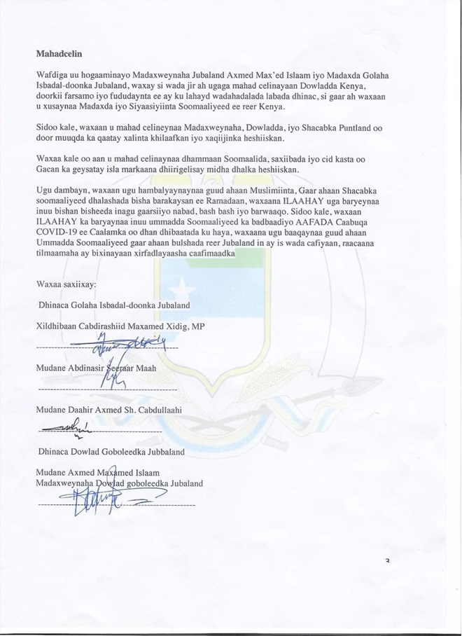 Khamiis, Abril 23, 2020 (HOL) - Madaxweynaha dowlad goboleedka Jubbaland Axmed Madoobe ayaa heshiis buuxa la gaaray golaha isbahaysiga isbedeldoonka Jubbaland oo ay ku midaysan yihiin murashixiinta ka hor yimid doorashadii sanadkii hore lagu doortay.
