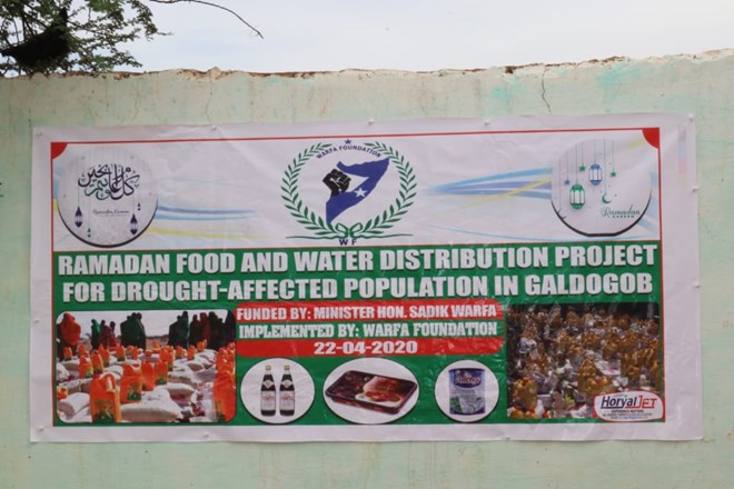 Dhinaca kale, hay'adda WARFA FOUNDATION ayaa garsiisay kaam ay ku nool yihiin qoysas danyar ah iyo kuwa ka soo barakacay abaaraha oo ku yaal duleedka degmada Galdogob saddex booyadood oo biyo ah oo ka timid wasiir Sadiq Warfa , oo loogu talagalay in bishan barakaysan dadka kaamkaas ku dhaqan ay ugu samata baxaan.