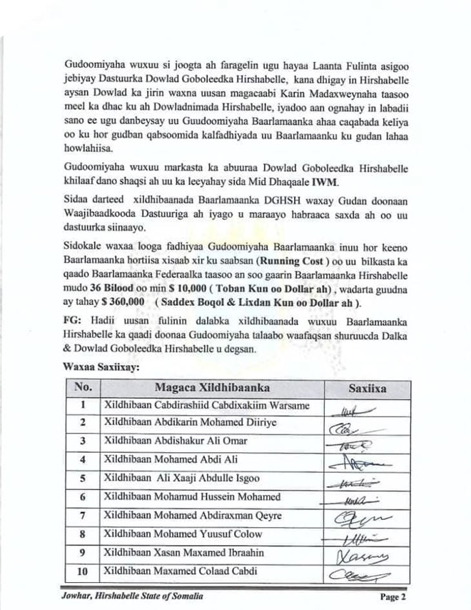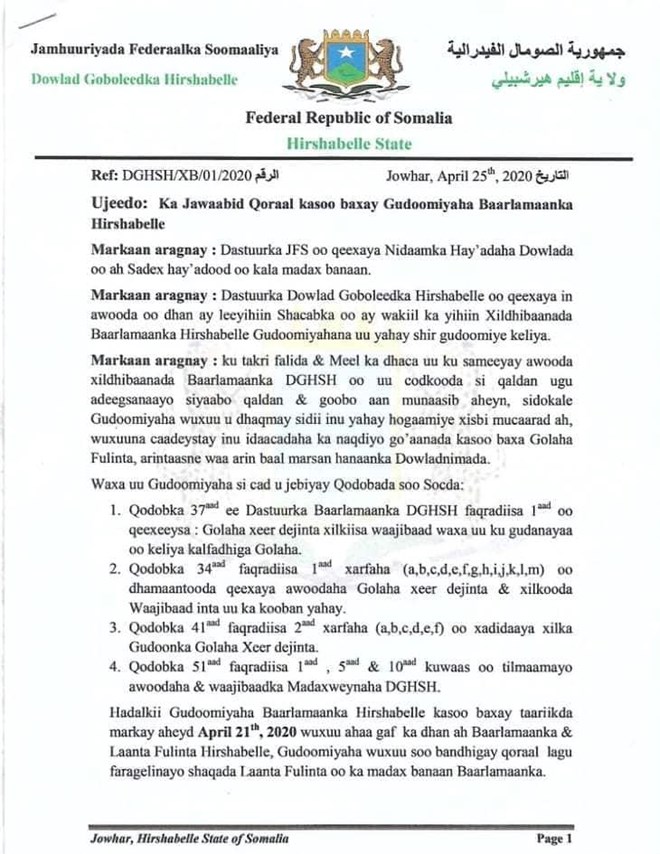 Sabti, Abril 25, 2020 (HOL) - Mudanayaal ka tirsan Baarlamanka Maamulka Hirshabeelle oo gaaraya 66 mudane ayaa waxey warqad u qoreen inuu ka jawaabo Guddoomiyaha Baarlamanka Hirshabeelle Cismaan Barre Maxamed , waxeyna ka codsadeen inuu ka warceliyo eedo ay usoo jeediyeen.